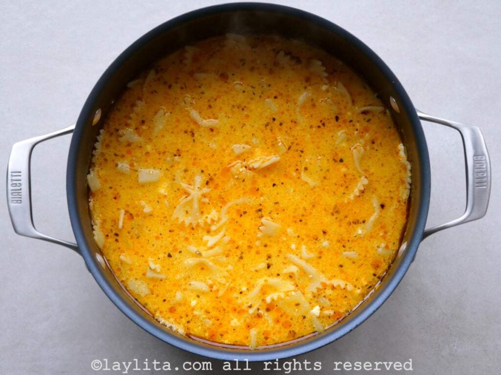 - Agrega la pasta y cocina hasta que tanto las papas como los fideos estén suaves y completamente cocidos, aproximadamente 12 a 15 minutos.