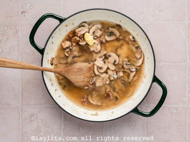 - Add white wine, scraping up any browned bits from the bottom of the skillet. Let it cook for 1-2 minutes, until slightly reduced. Stir in beef broth, Dijon mustard, and Worcestershire sauce. Bring to a simmer and cook until the sauce begins to thicken, 3-5 minutes.