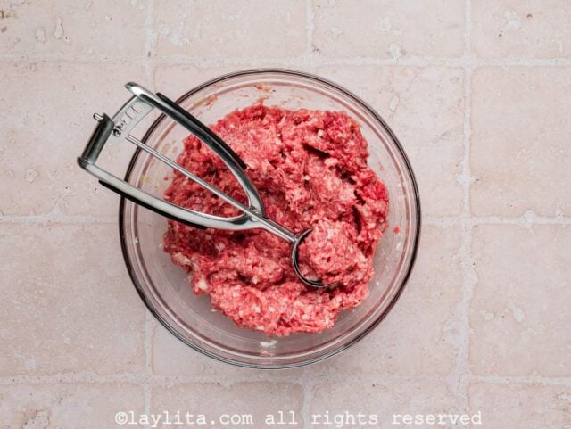 - Scoop a heaping tablespoon of the mixture using a cookie scoop or spoon and roll into meatballs. Lightly wet your hands if needed to prevent sticking.