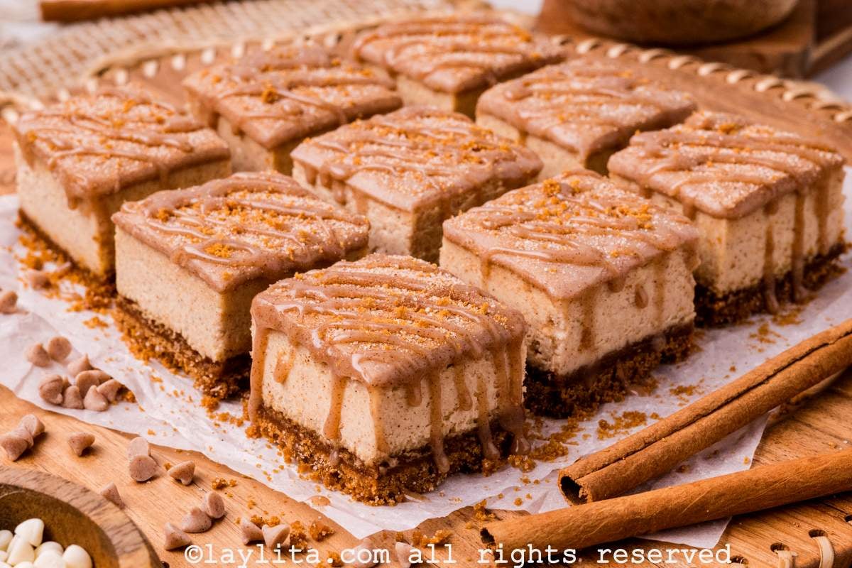 Smooth and creamy. The little crunch from the Biscoff crust and the cinnamon sugar on top just adds to the deliciousness of these cheesecake bars.